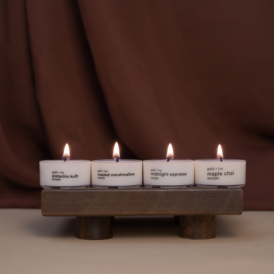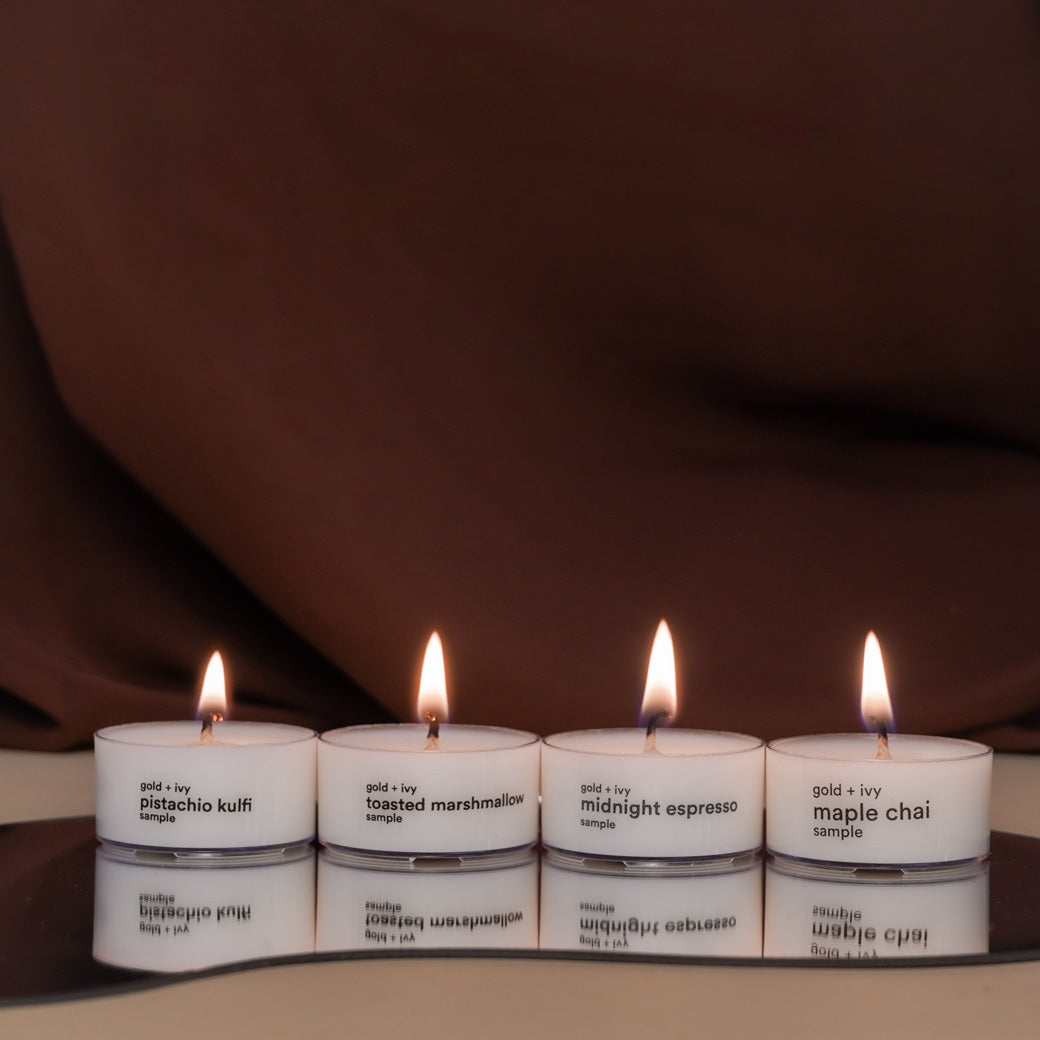Candles: our tea light candles are a fraction of our full sized candles (0.5 oz. each) + will not throw scent as much. they are for sampling only + are best tested in small spaces such as a bathroom or desk area. Approx. 4 hour burn time each
