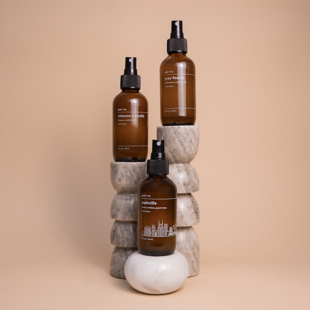 gold + ivy room sprays are made in Nashville, TN with water, natural odor counteractants, denatured alcohol, polysorbate 20, phthalate-free fragrance oils. Our sprays are always vegan, cruelty-free, phthalate-free, prop-65 free and paraben-free, so that you never have to sacrifice health for home fragrance.