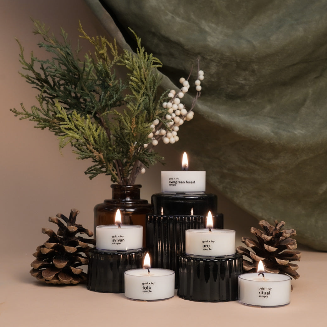 Candles: our tea light candles are a fraction of our full sized candles (0.5 oz. each) + will not throw scent as much. they are for sampling only + are best tested in small spaces such as a bathroom or desk area. Approx. 4 hour burn time each