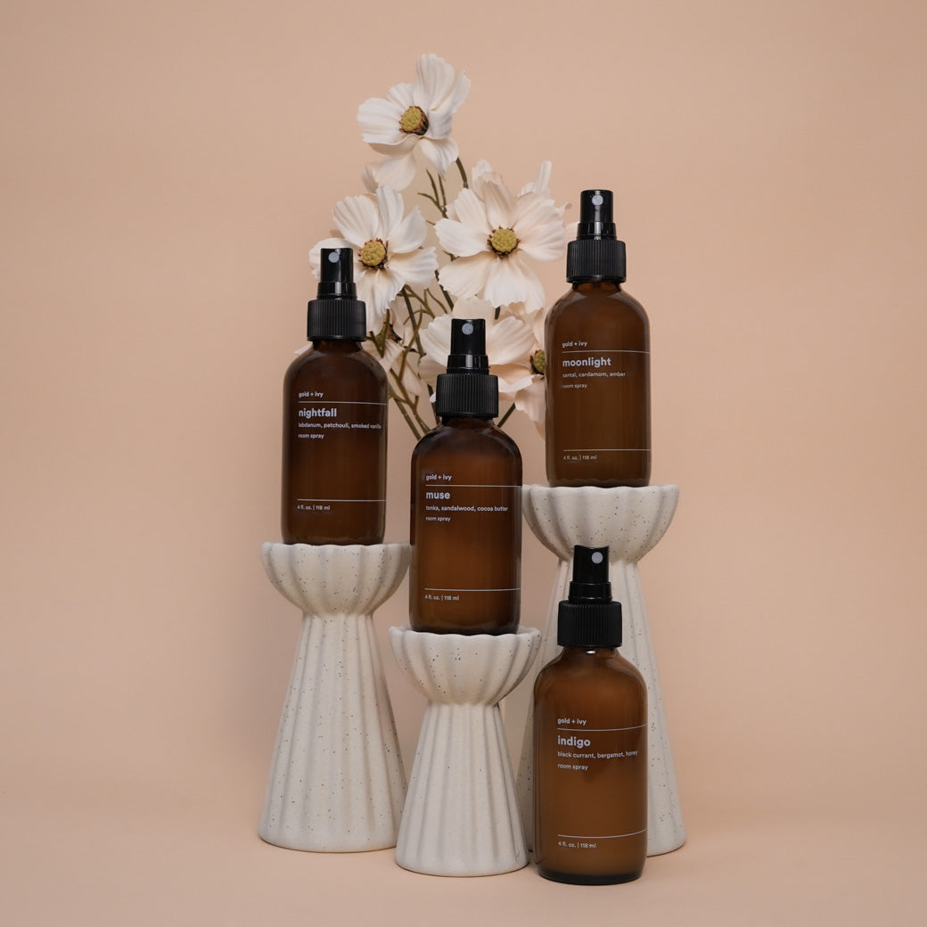 gold + ivy room sprays are made in Nashville, TN with water, natural odor counteractants, denatured alcohol, polysorbate 20, phthalate-free fragrance oils. Our sprays are always vegan, cruelty-free, phthalate-free, prop-65 free and paraben-free, so that you never have to sacrifice health for home fragrance.