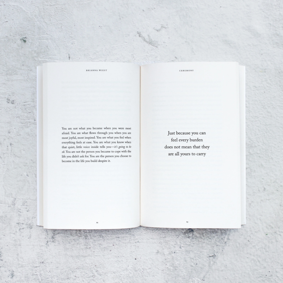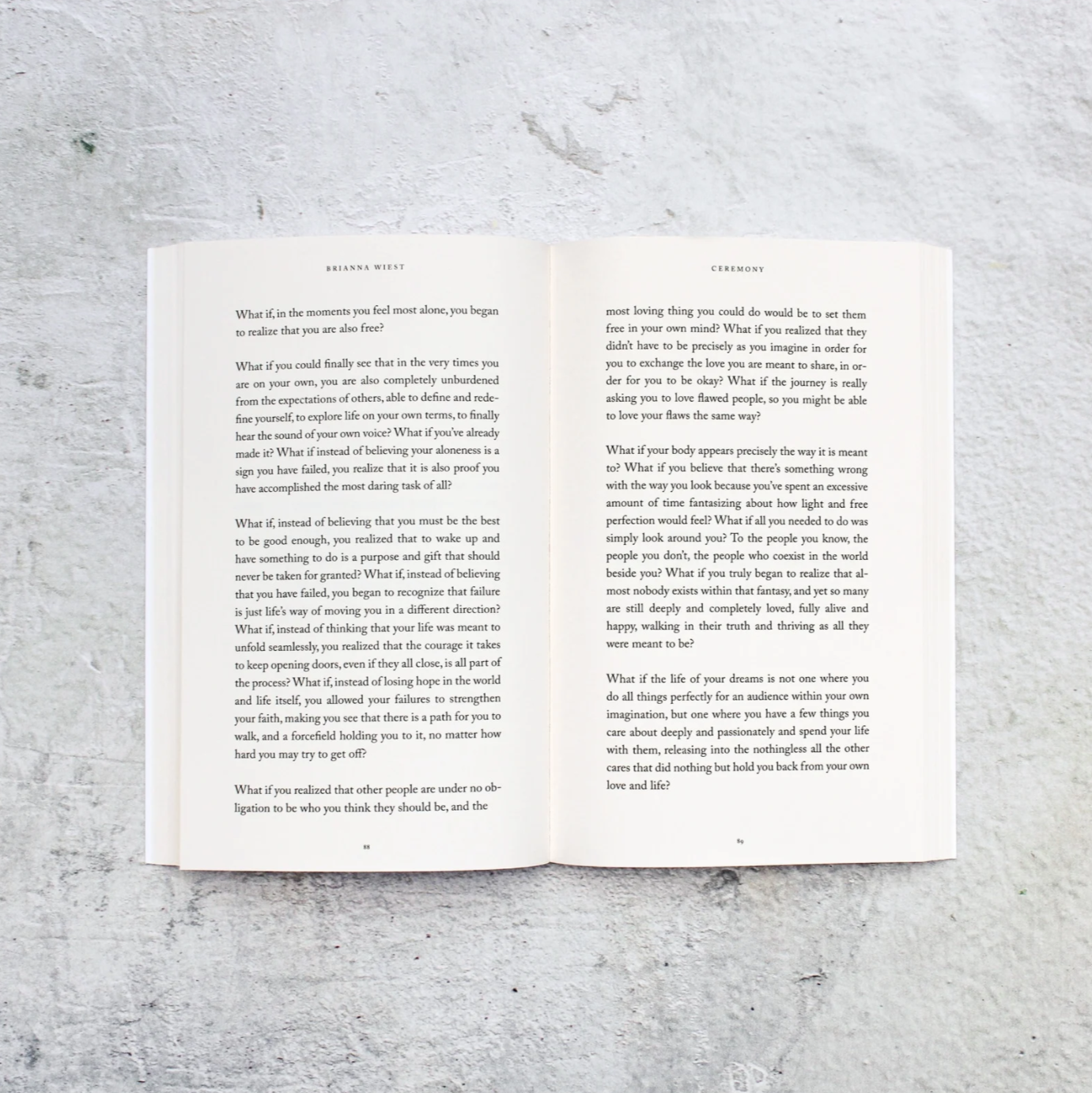 Ceremony is a collection for those on the cusp of becoming. It is a reminder that we were not meant to fit into this world perfectly, but to live in such a way that might forge a path all our own. It is a reminder that we are one with each other and nature itself. It is a reminder that we contain within us the latent potential of every future possibility we can conceive of. It is a reminder that we often must release what is not ours in order to receive what is, that we are all born with a unique imprint to leave upon the world, and that self-love is not an infatuation, but a homecoming. "Ceremony" is a book written around the idea that the most unlikely moments are often the very ones offering us a chance to meet ourselves deeply; it is a book for the ones who are ready to stop waiting and wondering, and dive all the way into who they were meant to be. Paperback, poetry and prose.