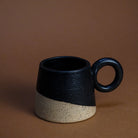 Slant mug in black with circle handle. natural finish on the outside with a clear glazed exterior.