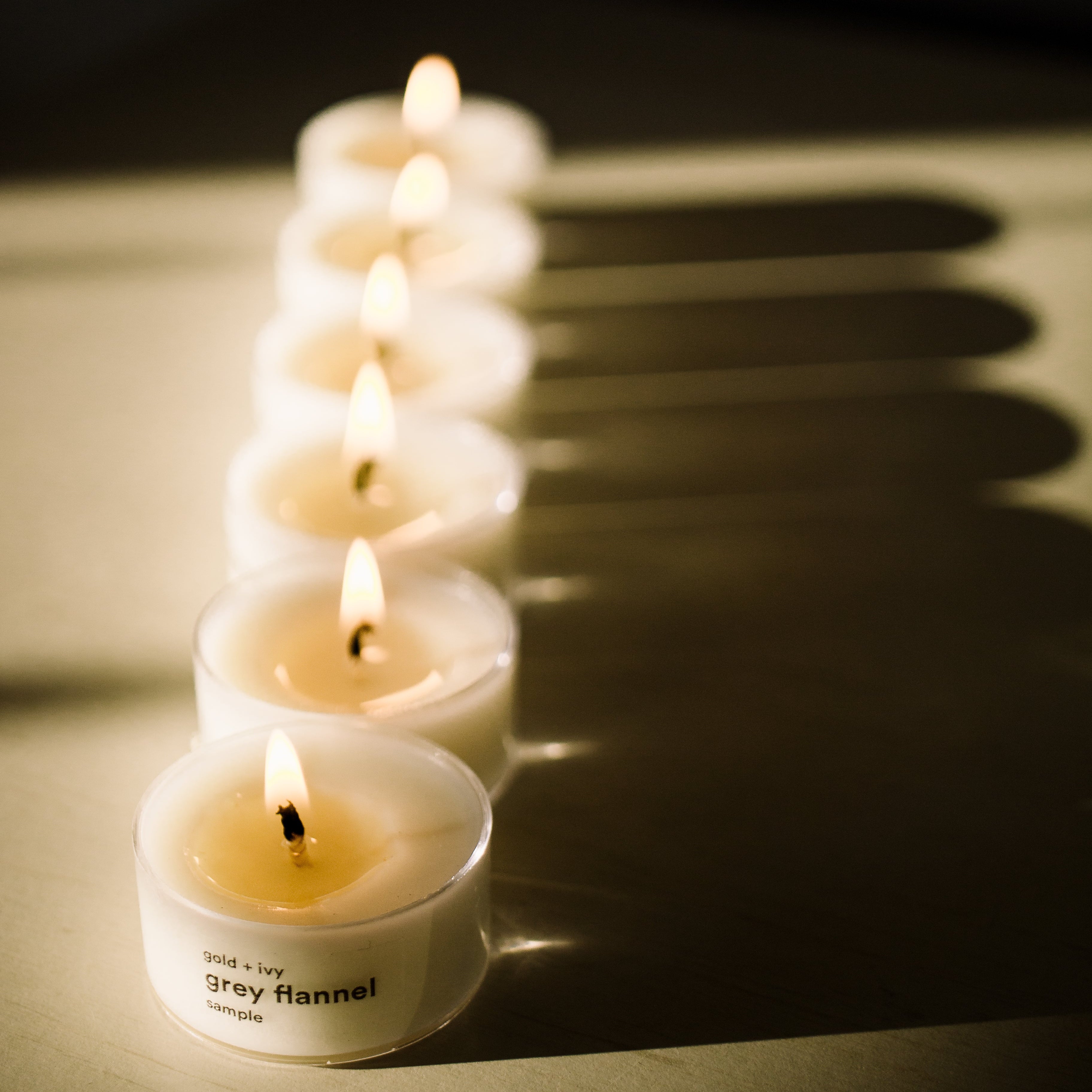 Candles: our tea light candles are a fraction of our full sized candles (0.5 oz. each) + will not throw scent as much. they are for sampling only + are best tested in small spaces such as a bathroom or desk area. Approx. 4 hour burn time each