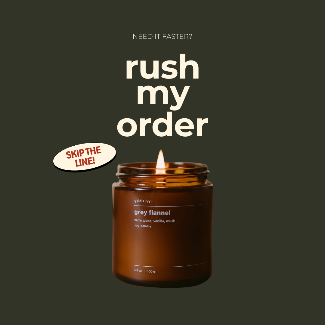 Need your candles a little faster? We’ve got you. Add this “Rush My Order” upgrade to move your order to the very top of our order queue. We will prioritize your order and have it ready to ship in 1–2 business days.